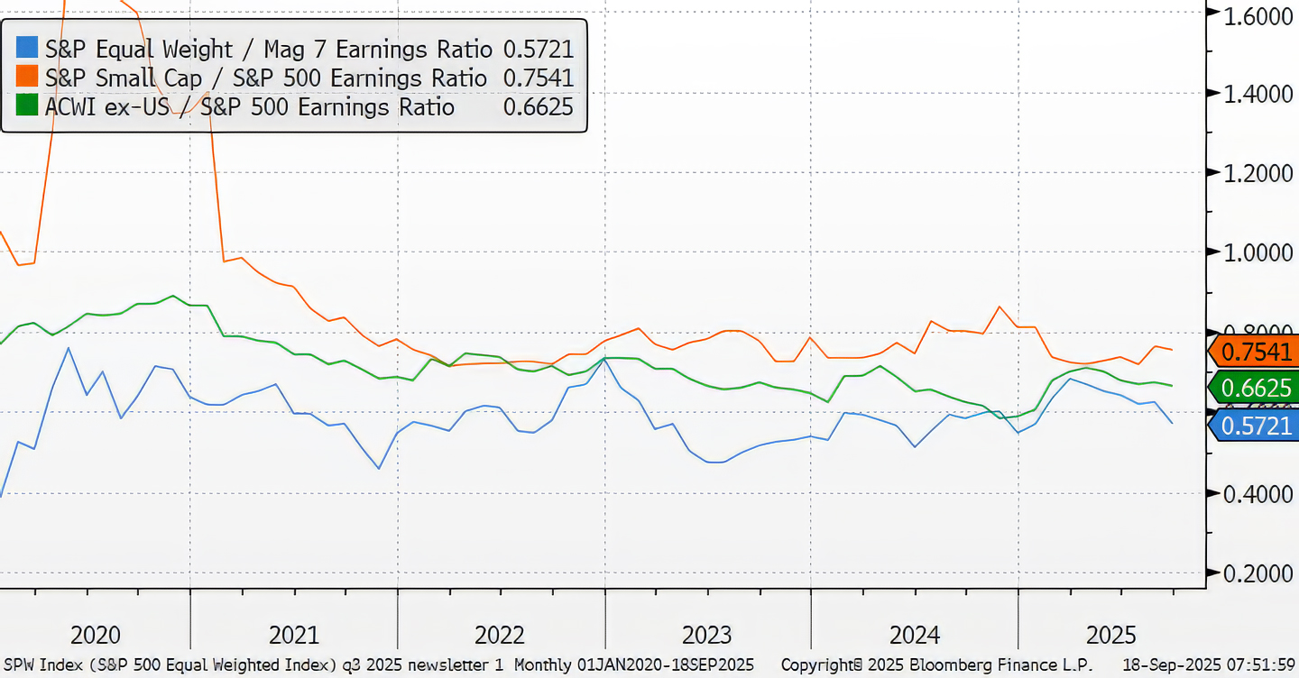 Figure 1 shows three distinct ratios of earnings relative to other indices. In blue, we take the forward price/earnings ratio of the Mag 7 Index and compare it to that of an equal-weighted index of all S&P 500 companies. The blue line shows that an equal weight index of the 500 largest US companies trades at about a 43% discount to that of its 7 mega-cap counterparts. To further illustrate the disparity in valuations, the orange line highlights the discount in earnings-generating US small cap companies relative to the S&P 500 Index. At a 25% discount to the S&P 500 Index, opportunities to own quality companies at attractive valuations offer compelling risk/reward characteristics in the small cap universe, particularly as a rate-cutting environment is seen as a tailwind to smaller companies. Finally, overseas companies are trading at a 34% discount to that of the S&P 500, as noted in green.